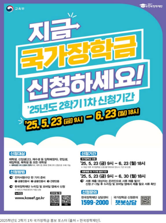 이런 현실 속에서 대학생들에게 큰 도움이 되는 제도가 바로 국가장학금입니다. 2025학년도 2학기 1차 국가장학금 신청이 5월 23일부터 6월 23일 오후 6시까지 진행됩니다. 해당 기간 내에 신청하지 않으면 장학금 혜택을 놓칠 수 있으니 꼭 일정 체크하세요.