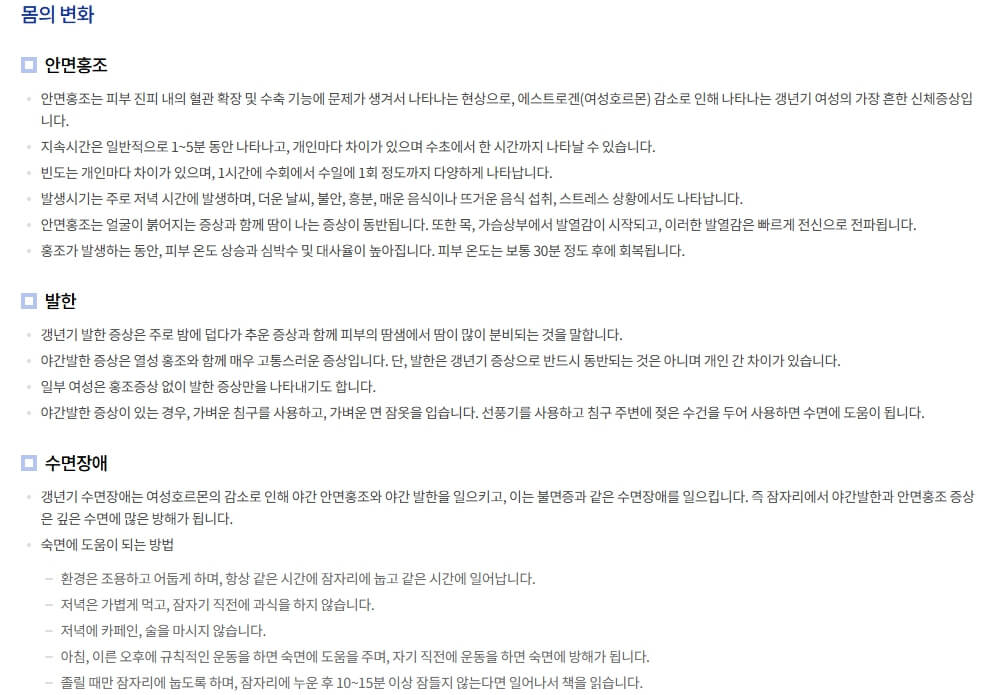 보다 자세한 갱년기 정보는 대한갱년기학회와 질병관리청의 자료를 참고해 주세요.